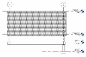 Na poniższym przykładzie poziom (pokazany strzałką) nazwałam GKF (Górny Poziom Fundamentu). Ściany konstrukcyjne fundamentowe zaczynają się na poziomie GKF i kończą na poziomie Poziom 0.