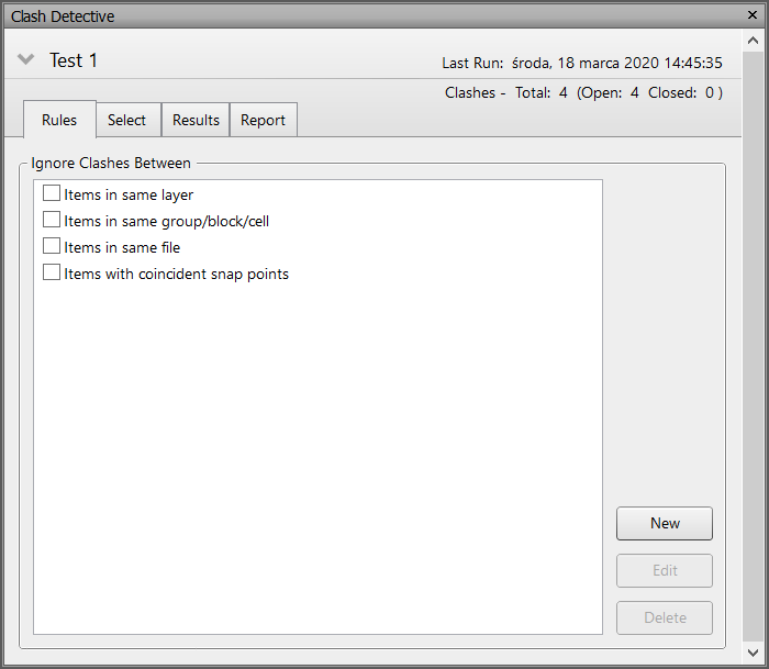 Reguły służą do określania jakie elementy będą ignorowane w trakcie przeprowadzania testu kolizji. Korzystanie z reguł zmniejsz ilość wyników kolizji, które Wy jako koordynatorzy musicie analizować. Program posiada 4 domyślne reguły:
