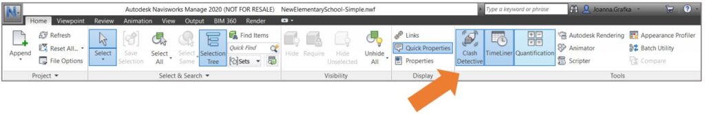 Okno dialogowe wykrywania kolizji jest dostępne z paska narzędzi Home >> z panelu Tools wybierz >> narzędzie Clash Detective.