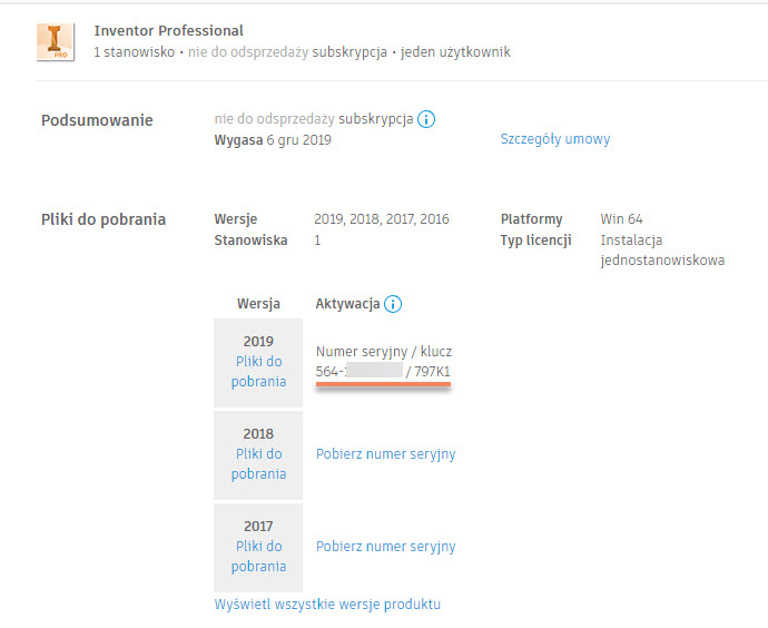 W przypadku rozwinięcia produktu z licencją dla Wielu użytkowników, otrzymamy numer seryjny. Natomiast jest on zapisywany automatycznie w generowanym pliku licencji (osobny artykuł – Generowanie pliku licencji) i w przypadku instalacji nowego oprogramowania nie będziemy się zazwyczaj nim interesować. Inaczej jest w przypadku wersji Jeden użytkownik, ponieważ podczas aktywacji produktu zostaniemy poproszeni o zalogowanie się w programie przy pomocy konta Autodesk lub podanie numeru seryjnego wraz z kluczem produktu (lista kluczy produktów dostępna w osobnym artykule).