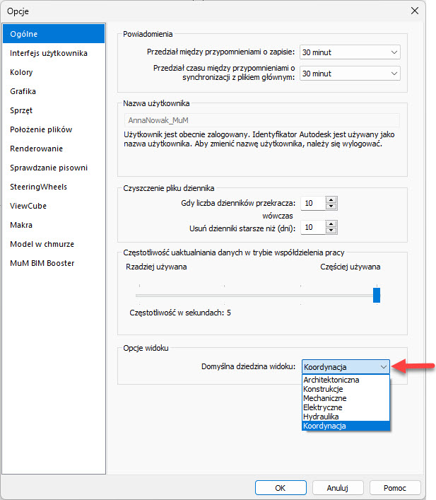 Źródło tego zachowania znajdziemy w oknie dialogowym Opcje w Revit. W zakładce Ogólne, w sekcji Opcje widoku można wybrać z listy dziedzinę dla widoku (nowo zainstalowany Revit posiada zazwyczaj ustawienie Koordynacja).