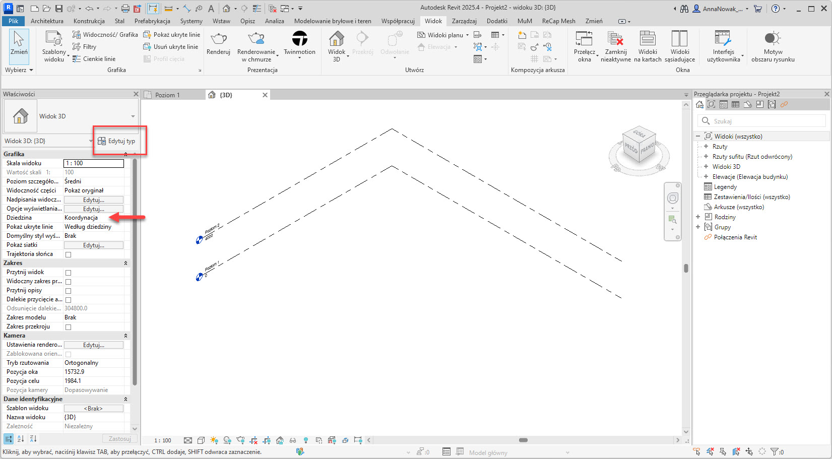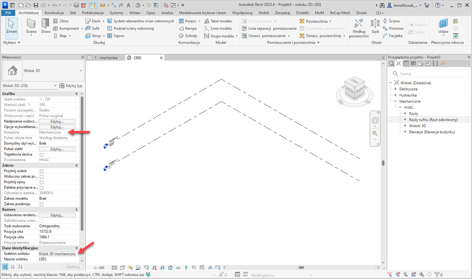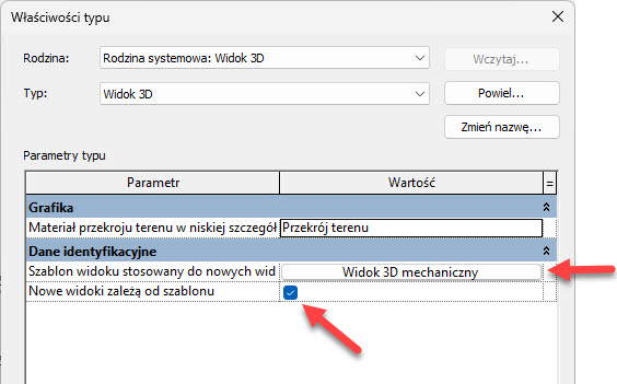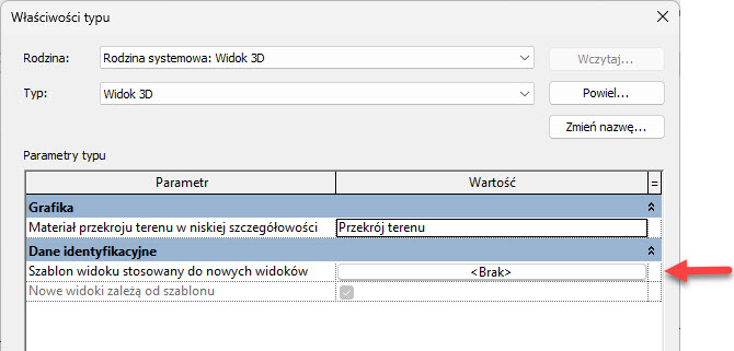 Aby to sprawdzić uaktywnij wygenerowany w ten sposób widok 3D i na panelu Właściwości kliknij Edytuj typ. W wierszu Szablon widoku stosowany do nowych widoków znajduje się zapewne nazwa szablonu widoku (poniżej Widok 3D mechaniczny). Jeśli dodatkowo zaznaczona jest opcja Nowe widoki zależą od szablonu, dziedzina będzie niemożliwa do zmiany o ile parametr podlega pod szablon.