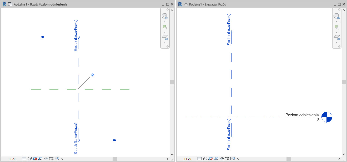 W widoku Poziom odniesienia widoczne są dwie płaszczyzny prostopadłe do ekranu (o nazwach Centrum (Przód/Tył) oraz Centrum (Przód/Tył), widocznych po wskazaniu płaszczyzny), a w widoku elewacji Przód trzecia, nienazwana, pokrywająca się z poziomem odniesienia.