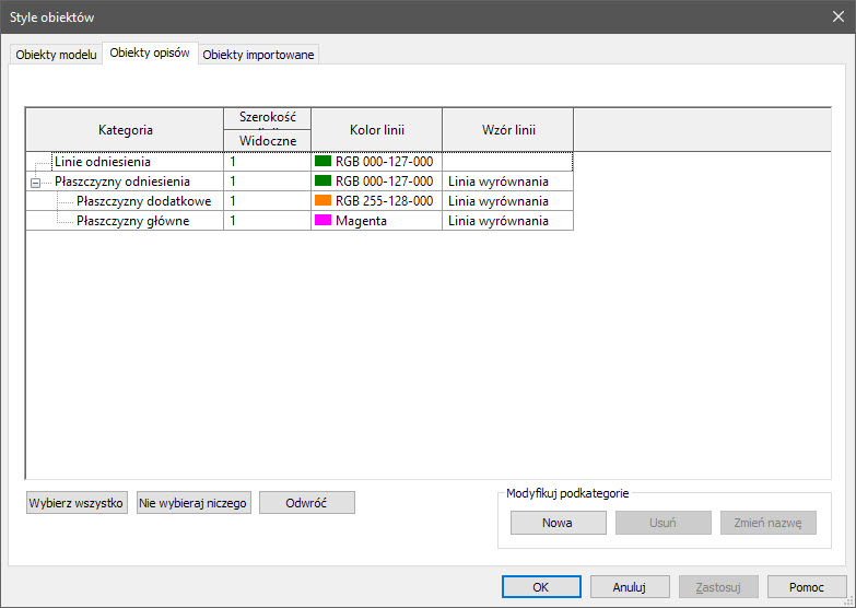 Właściwość Podkategoria pozwala przypisywać płaszczyzny do ręcznie utworzonych podkategorii w rodzinie i w ten sposób je grupować, aby np. łatwiej sterować widocznością poszczególnych grup płaszczyzn w rodzinie.