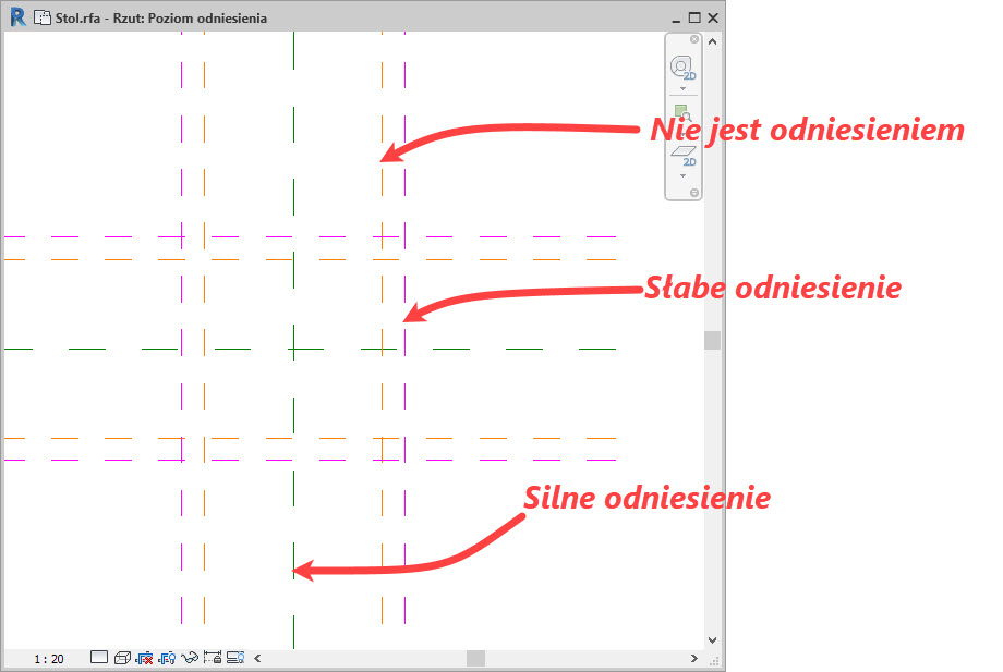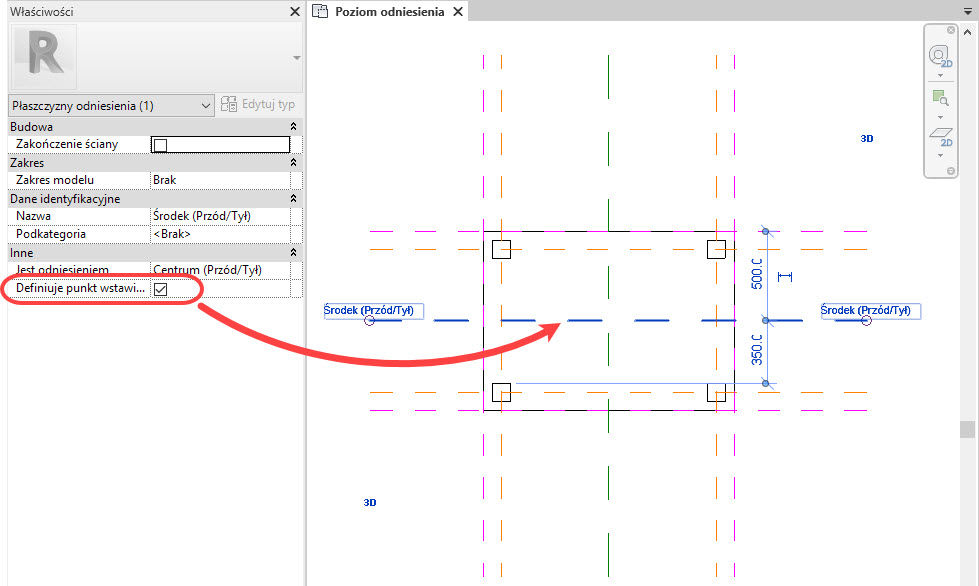 Wybranie Nie jest odniesieniem sprawi, że płaszczyzna będzie „niewidoczna” dla wymiarowania w projekcie, nie będzie generować wymiarów tymczasowych, nie będzie dostępna podczas wyrównywania ani widoczna dla jakiegokolwiek przyciągania w projekcie (np. osiowe płaszczyzny odniesienia nóg stołu, potrzebne do konstrukcji rodziny ale niepotrzebna podczas pracy w projekcie).