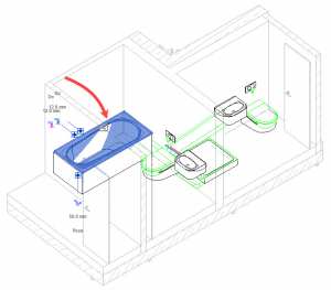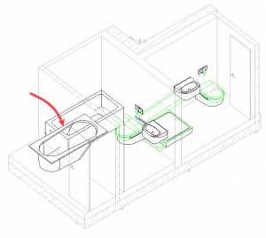 Drugie z poruszonych na początku bloga zagadnień to zmiana punktu bazowego, czyli punktu wstawienia elementu bibliotecznego. Przykładowo, dla projektów wielobranżowych, po dokonaniu mapowania osprzętu hydraulicznego architektonicznego i instalacyjnego często położenie obiektów nie zgadza się. Poniżej po lewej sytuacja początkowa z niedopasowanymi punktami bazowymi oraz sytuacja po poprawieniu punktu bazowego w osprzęcie w modelu instalacyjnym i wczytaniu nowej wersji rodziny do projektu.