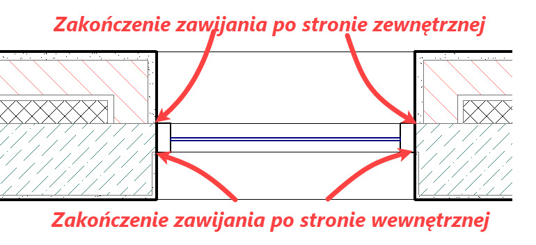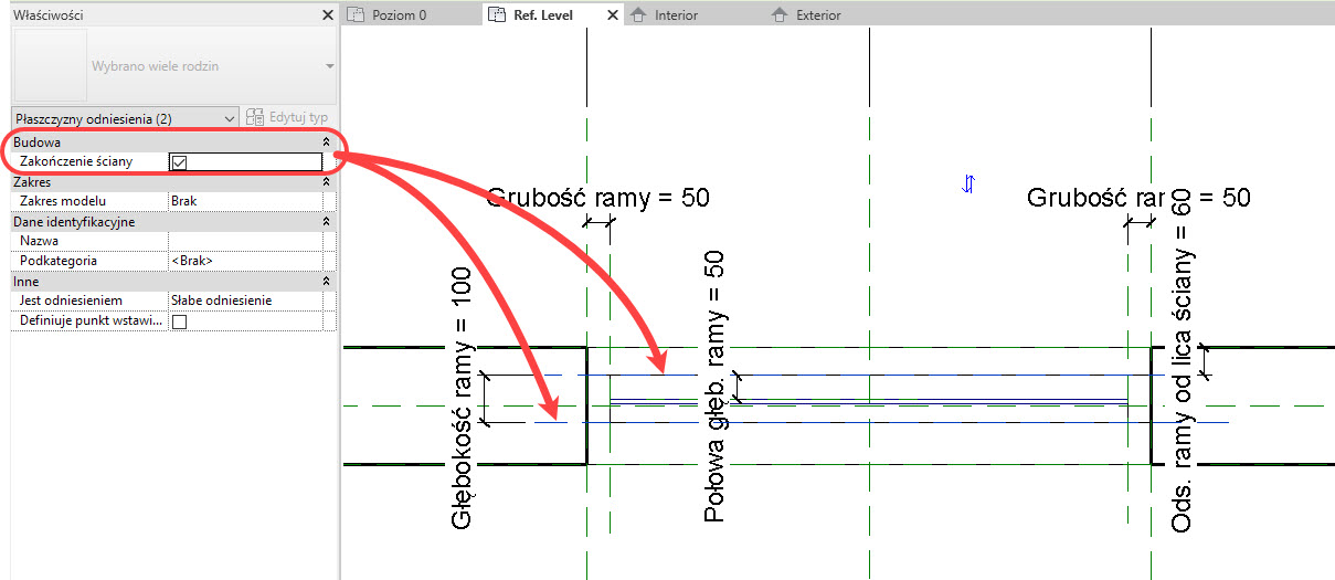 Dla rodzin wstawianych w ściany, takich jak okna i drzwi, istnieje potrzeba zdefiniowania zachowania stolarki w sytuacji, gdy włączona jest opcja typu ściany o nazwie Zawijanie przy otworach. Włączenie opcji Zakończenie ścianypozwala ustalić limit dla zawinięcia warstw ściany. Rodzina może mieć maksymalnie dwie płaszczyzny z włączoną opcją, analogicznie do opcji włączenia zawijania zewnętrznych i wewnętrznych warstw ściany.