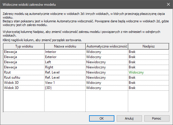 Podobnie jak w projekcie, można ustalać widoczność płaszczyzn zakresu w każdym z widoków rodziny.