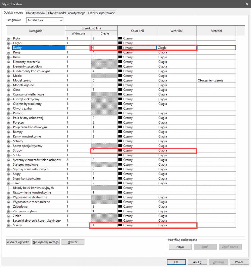 Dodatkowo, zazwyczaj grubość linii widocznej (nieciętej) obiektu jest mała, grubość linii ciętej – duża. Ustawienie wprowadza się w generalnym oknie ustawień stylów obiektów w projekcie Revit. Narzędzie