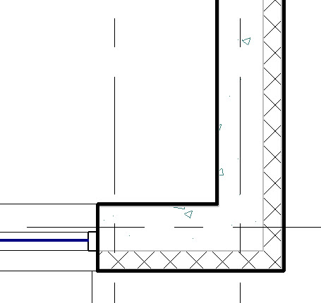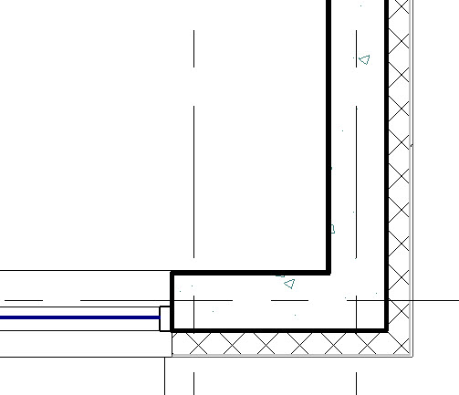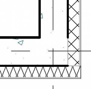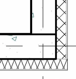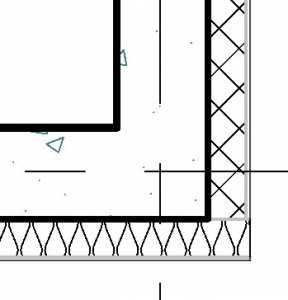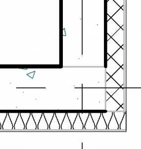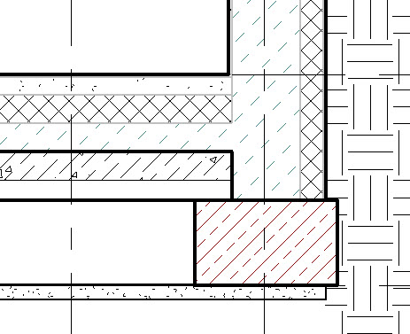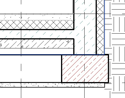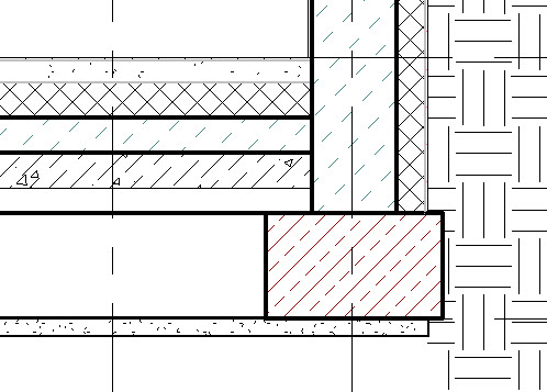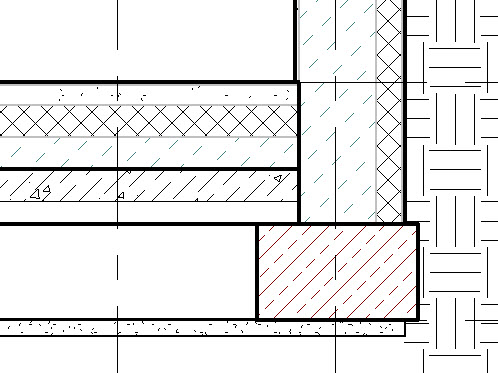 Przy tym ustawieniu przykładowy przekrój przez strop i ścianę wyglądałby jak niżej – pogrubienie linii jest widoczne na zewnętrznych krawędziach wielowarstwowego stropu i wielowarstwowej ściany (po lewej strop i ściana niedołączone, po prawej dołączone poleceniem (Dołącz)).