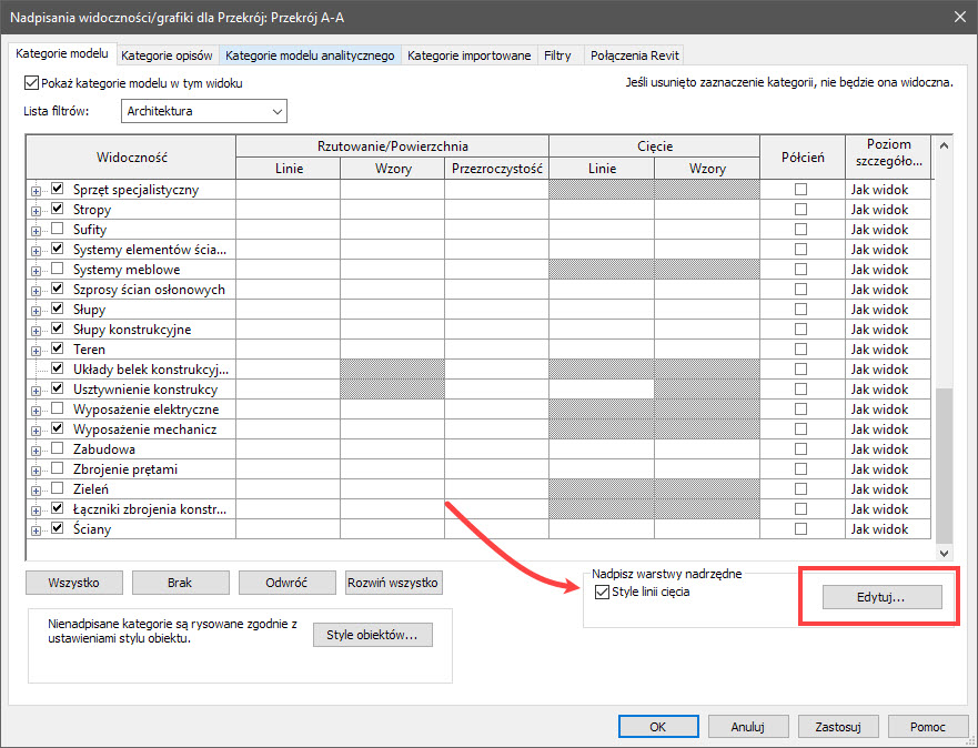 W prawej dolnej części okna Nadpisania widoczności grafiki znajduje się opcja Style linii cięcia. Gdy ją zaznaczymy uaktywnia się przycisk Edytuj… .