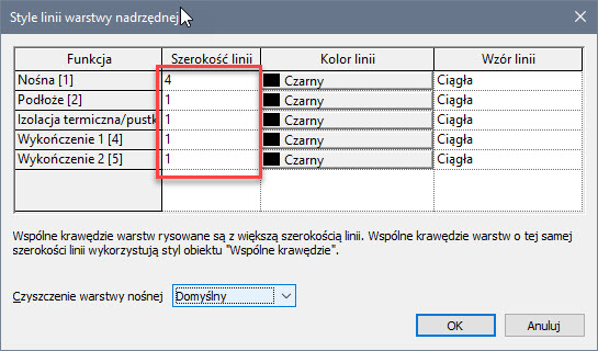 Ustawiam odpowiednio większą grubość linii dla warstwy o funkcji Nośna, zazwyczaj jest to zależnie od standardu około 4 lub 5 (w moim projekcie przykładowym odpowiedni pisak to 4), pozostałym przypisuję grubość 1. Opcjonalnie można zróżnicować kolory pod względem funkcji oraz rodzaj linii.