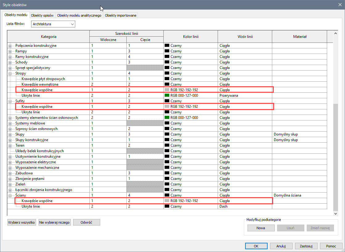 Prezentację podkategorii Wspólna krawędź można ustawić po rozwinięciu głównej kategorii takich obiektów wielowarstwowych, jak Ściany, Stropy, Sufity czy Dachy. Na przykładzie poniżej ustawiłam dla krawędzi wspólnych, aby w widoku stosowały pisak o grubości 1, gdy cięte pisak o grubość 2 a kolor jasnoszary. Oczywiście to jedynie jedno z wielu możliwych rozwiązań – grubości linii krawędzi wspólnych nie muszą być różnicowane – często użytkownicy ustawiają je w widoku i gdy cięte na linię cienką, np. 1 bez nadpisywania kolorów.