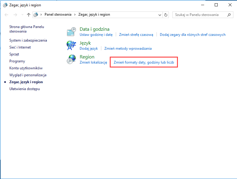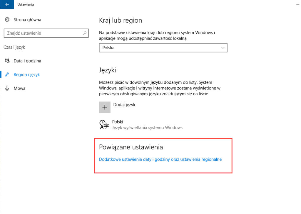 Aby móc utworzyć zadanie tworzenia kopii bezpieczeństwa musimy lekko „oszukać” system. W tym celu przed przystąpieniem do konfiguracji zadania z poziomu ADMS musimy przejść do ustawień systemu Windows do sekcji Kraj lub region.