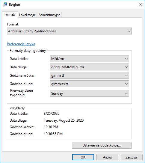 Z listy dostępnych formatów wybieramy Angielski (Stany Zjednoczone).