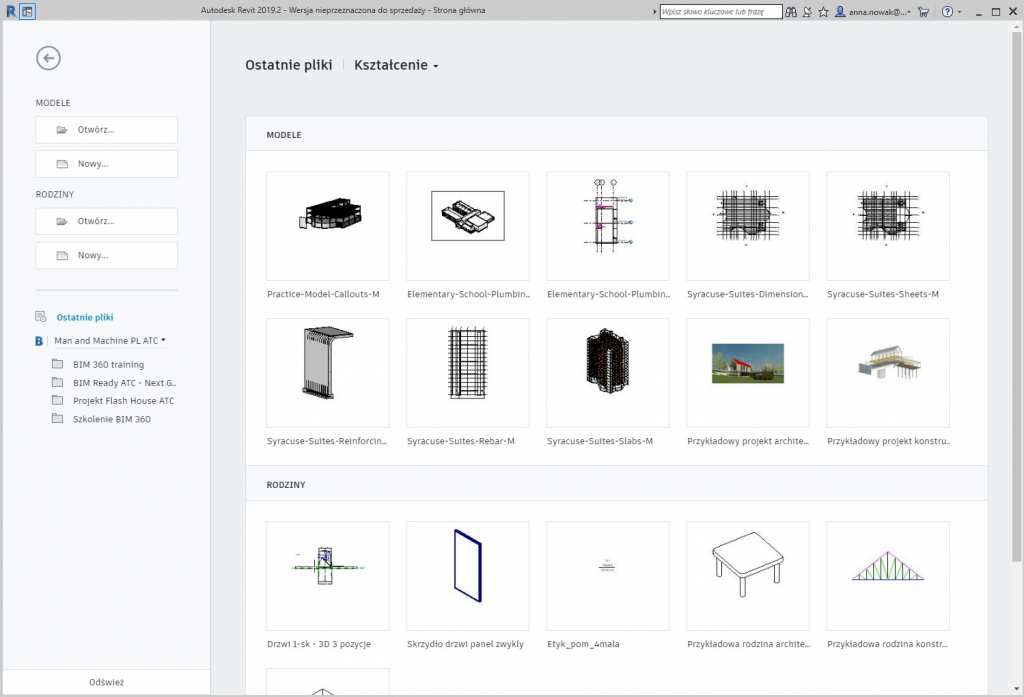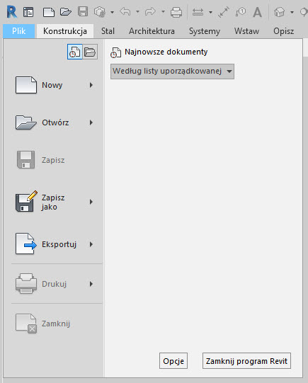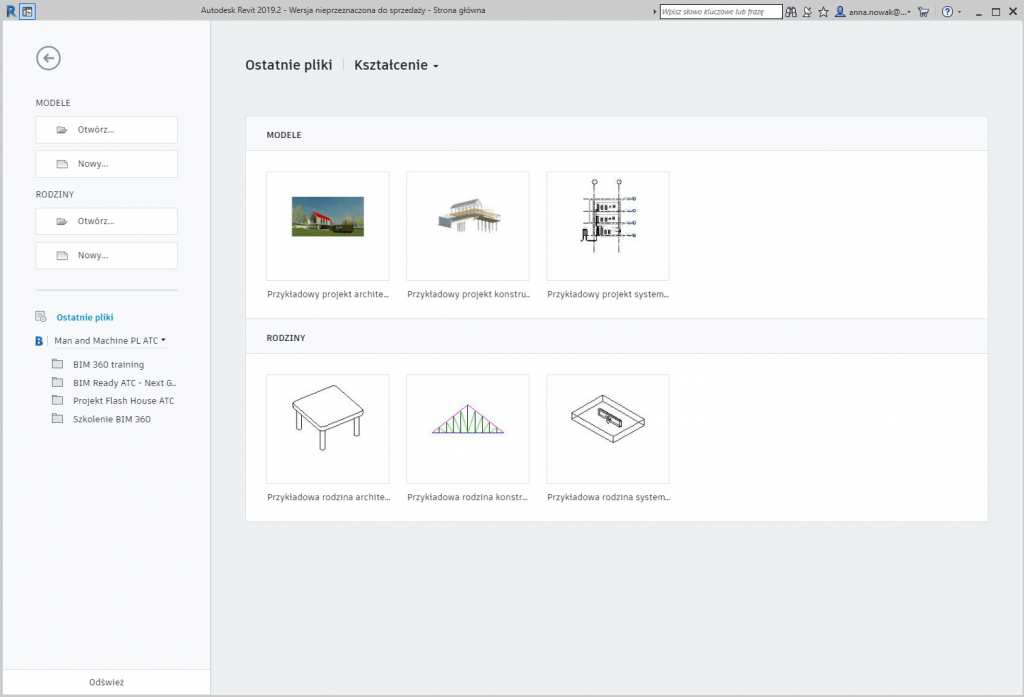 Zapisuję zmiany i uruchamiam program Revit. Panel startowy zawiera po trzy przykładowe projekty i rodziny, jak w świeżo zainstalowany programie.