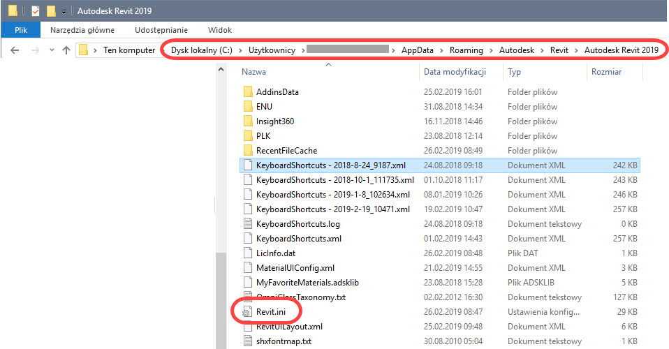 C:\Użytkownicy\<profil użytkownika>\AppData\Roaming\Autodesk\Revit\Autodesk Revit 2019\Revit.ini