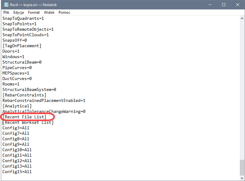 Upewniam się, że program Revit jest zamknięty, robię kopię zapasową pliku Revit.ini (ważne!) i otwieram plik Revit.ini za pomocą Notatnika Windows.