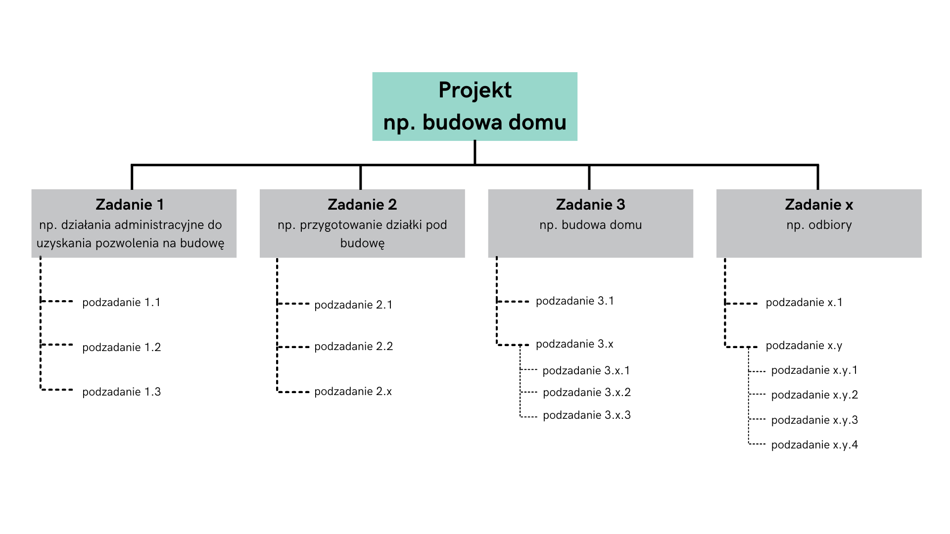 Aplikacje, które dziś Ci pokażę działają w oparciu o tzw. work breakdown structure, czyli na strukturze podziału pracy. Jest to hierarchiczny opis działań i zadań, które jest niezbędne do realizacji celu projektu. W odniesieniu do branży budowlanej (np. budowa domu) SPP wyglądać może tak: