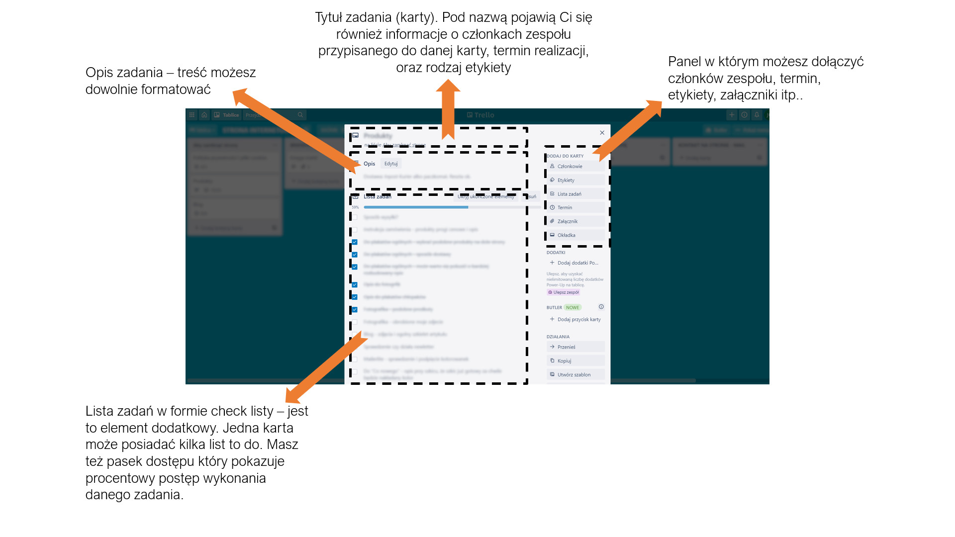Trello działa właśnie na takiej zasadzie. Wydaje się to zbyt uproszczone narzędzie? Nic mylnego. Dobrze skonfigurowane parametry i współdzielenie to z zespołem i możesz skutecznie zarządzaj projektem. Praca w Trello opiera się na tablicach, listach i kartach. Poniższa grafika pokaże Ci jak wygląda aplikacja z aktywną kartą zadania: