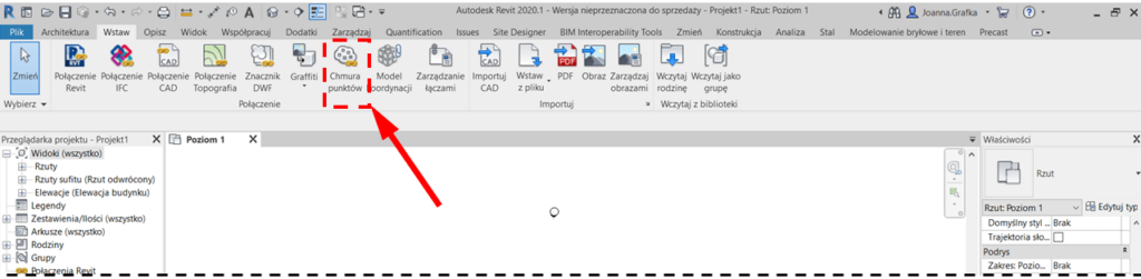Chmurę punktów możesz połączyć z projektem, bez większych problemów, aby zapewnić dokładne odniesienie wizualne istniejącego stanu budynku lub otoczenia. Ze względu na to, że skanowanie laserowe dostarcza miliardy punktów, dlatego do Revit wkleja się ją jako odniesienie, a nie plik. Połączenie pliku do projektu wykonujesz podobnie do podłączania innych odnośników. Jeśli jednostka miary w dołączonej chmurze punktów jest inna niż w rysunku docelowym, chmura automatycznie skaluje się do typu jednostki w rysunku docelowym.