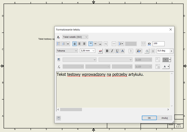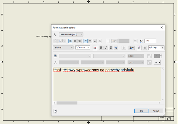 Problemem dla nas, polskich użytkowników Inventor-a jest to, że słownik w naszym języku nie został uwzględniony. W związku z tym wszelkie teksty wprowadzone po polsku są podkreślane jako błędne. Możemy jednak zauważyć, że w powyższym przykładzie „Tekst” oraz „artykułu” nie zostały podkreślone, choć są po polsku. Zjawisko takie może powodować mylne wrażenie, że program może jednak obsługuje język polski. Niestety, nic bardziej mylnego. Brak podkreśleń w tym zdaniu wynika z tego, że „Tekst” został napisany wielką literą a po wyrazie „artykułu” została postawiona kropka. Program domyślnie ignoruje wyrazy, w których: użyto wielkiej litery, zawarto cyfry oraz znaki interpunkcyjne. Dla porównania poniżej to samo zdanie, bez użycia wielkich liter i znaków interpunkcyjnych.