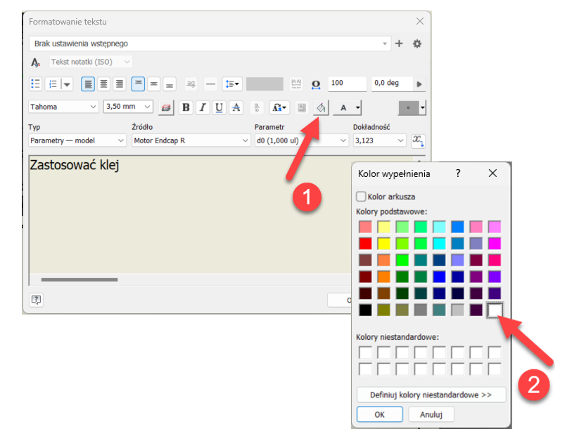 W przypadku polecenia tekst czy tekst linii odniesienia należy wybrać opcję wypełnienie tła (1) a następnie należy ustawić kolor wypełnienia na biały (2).