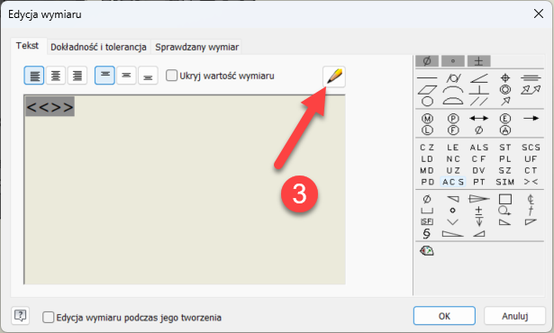Aby zmienić tą właściwość dla wymiaru to w oknie Edycja wymiaru należy przejść do edytora tekstu (3).