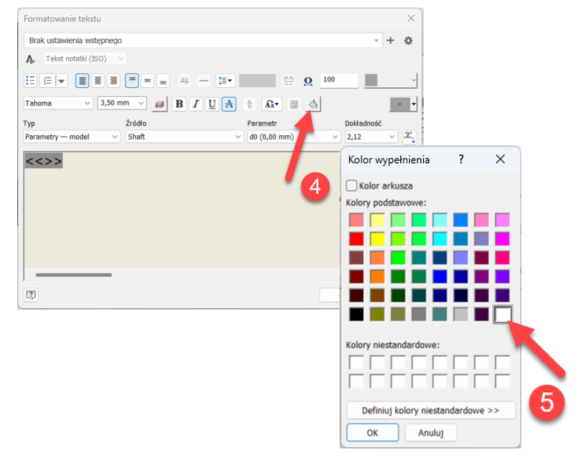 Dalej już dokładnie te same kroki co w przypadku tekstu, czyli należy przejść do wypełnienia tła (4) i ustawić kolor wypełnienia (5) na biały.