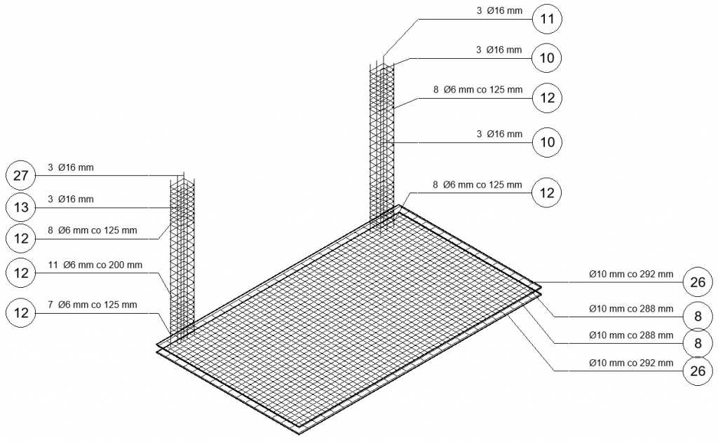 Posłużę się nieskomplikowanym modelem, zawierającym zbrojenie dwóch slupów oraz zbrojenie powierzchniowe stropu, jak niżej.