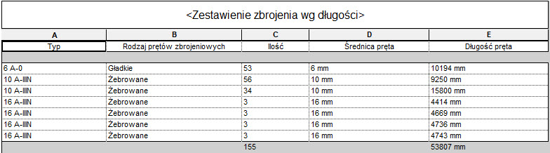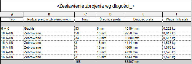Tworzę typowe zestawienie, dodając pola Typ, Rodzaj prętów, Ilość, Średnica pręta i Długość pręta.
