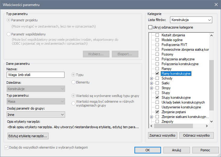 W typowym szablonie rodziny prętów nie posiadają parametru wagi 1mb. Dodaję zatem w projekcie parametr Waga 1mb stali dla kategorii Zbrojenie prętami, mogę też dodać go dla ram i słupów konstrukcyjnych, jak niżej, o ile w projekcie wystąpią takie profile stalowe i na bazie danych od producenta będziemy mogli również policzyć łączną masę stali konstrukcyjnej.
