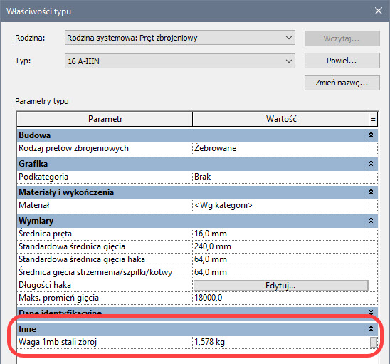 Zaglądam do właściwości typu dowolnej rodziny pręta w projekcie – wpisuję stosowną wartość dla średnicy.