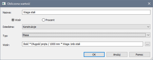 Brakuje pola, które obliczy mi wagę zbrojenia w projekcie. W zestawieniu, w zakładce Pola, korzystam z funkcji (Dodaj obliczony parametr). Dodaję parametr typu Masa o nazwie Waga stali, z wzorem Ilość * Długość pręta / 1000 mm * Waga 1mb stali.