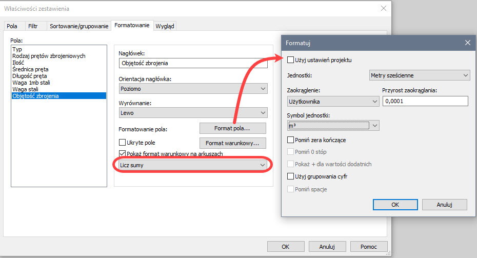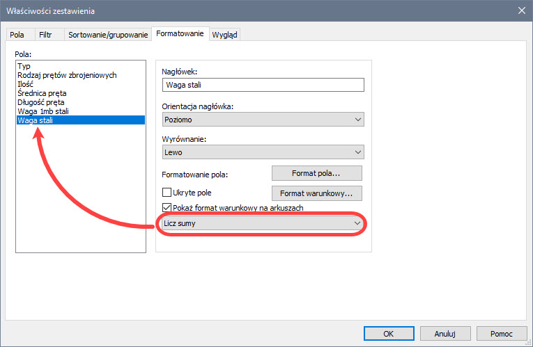 Dodaję kolumnę Objętość zbrojenia, z włączoną opcją Licz sumy w zakładce Formatowanie. Ustawiam też odpowiednio format pola Objętość zbrojenia jako metr sześcienny, wartość do czterech miejsc po przecinku.
