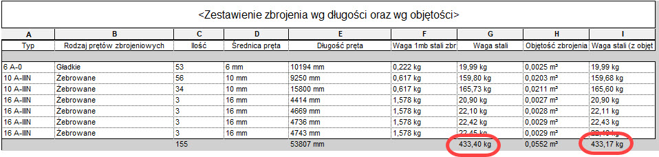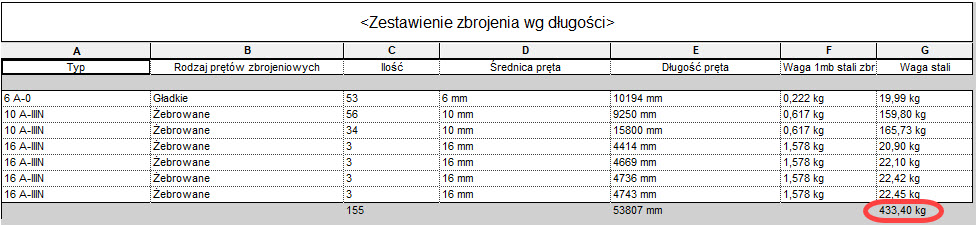Gdyby rodzina pręta w Revit posiadała współczynnik masy, to po pomnożeniu tego współczynnika przez ilość prętów oraz przez długość uzyskalibyśmy masę prętów.