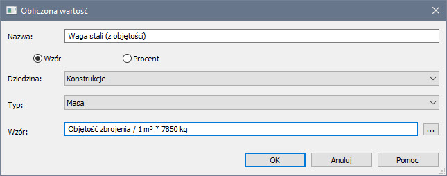 Następnie tworzę w zestawieniu nowy obliczony parametr (Dodaj obliczony parametr), o nazwie Waga stali (z objętości), o wzorze Objętość zbrojenia / 1 m³ * 7850 kg, jak niżej, z włączeniem opcji Licz sumy w zakładce Formatowanie.