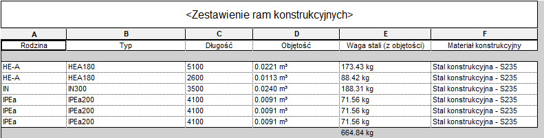 Dla porównania posłużę się tą samą tabelą zestawienia Revit jak dla wcześniejszej metody.