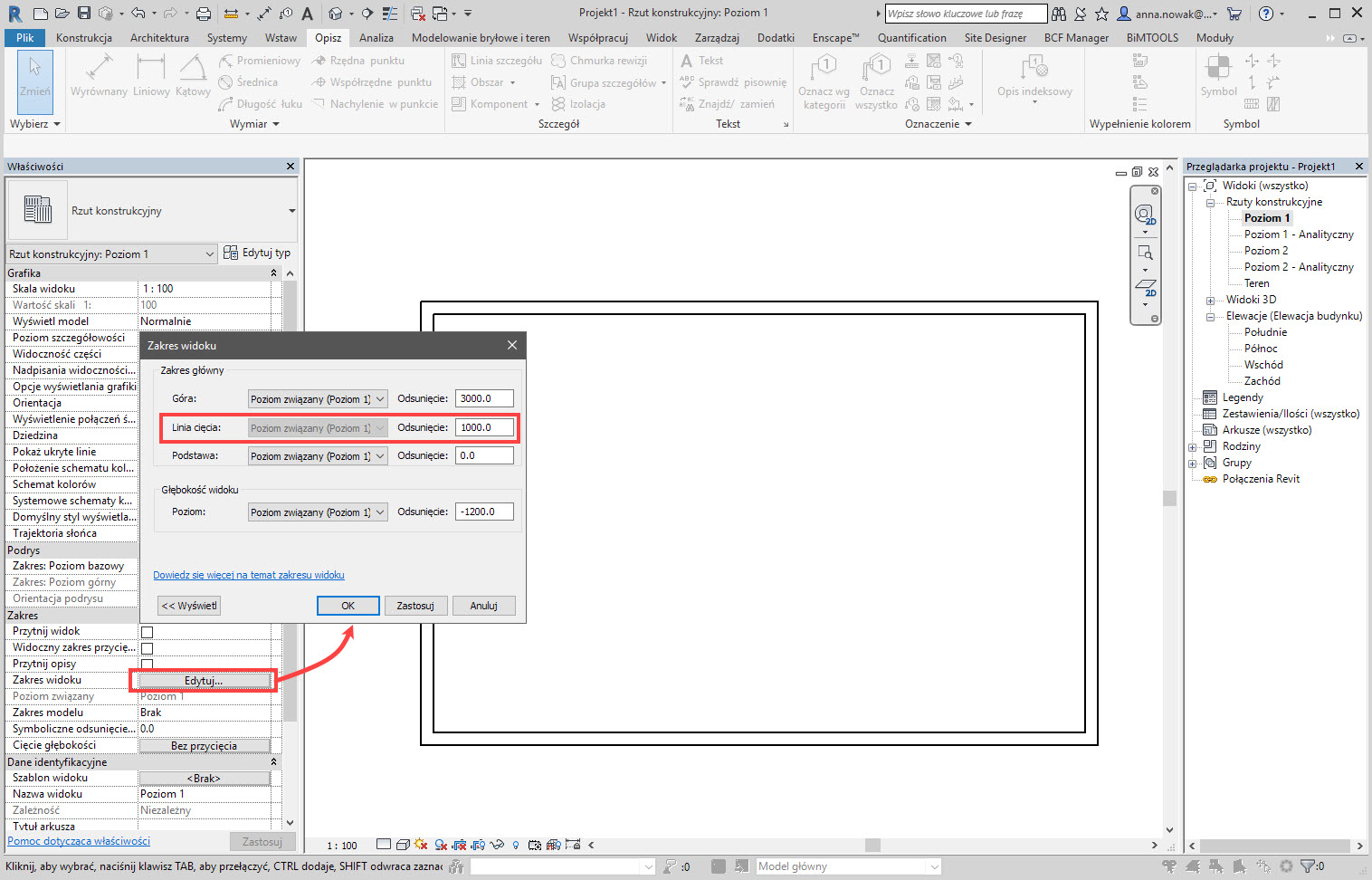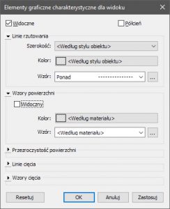 Istnieje możliwość ustawienia dla wyznaczonego obszaru widoku rzutu innych ustawień zakresu widoku, w tym wysokości cięcia, niż generalna wysokość cięcia ustawiona w okienku Zakres widoku. Służy do tego narzędzie (Obszar rzutu), które można znaleźć w zakładce Widok po rozwinięciu listy