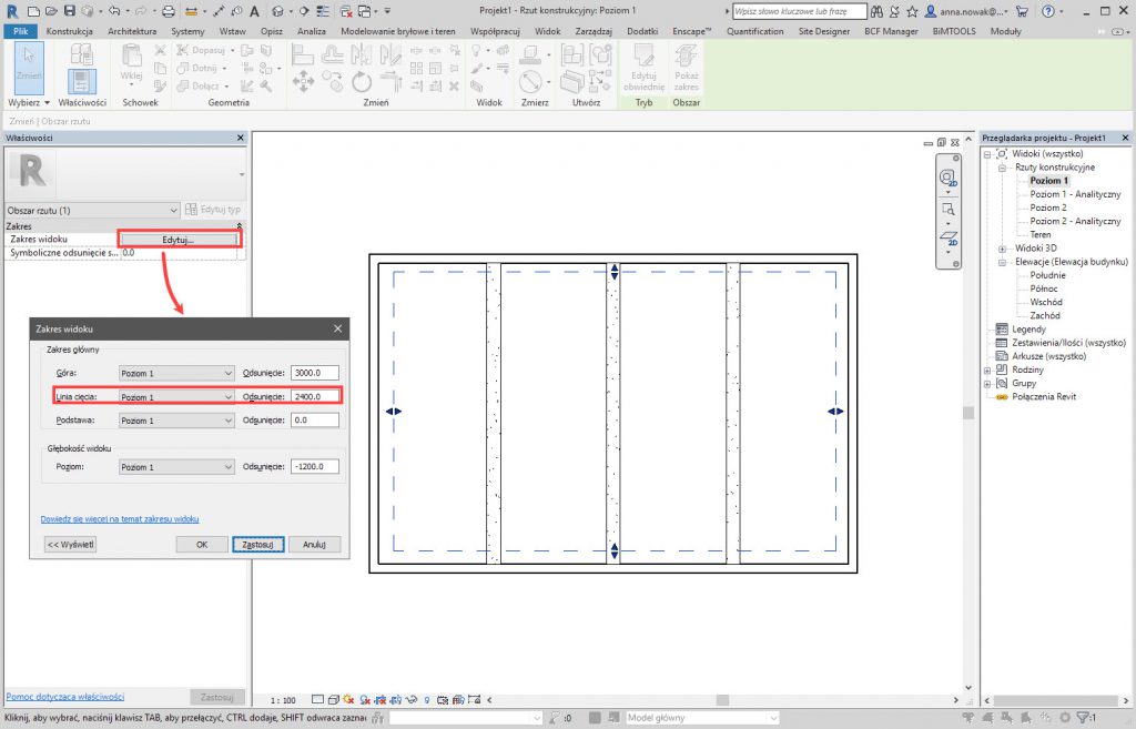 W naszym przykładowym projekcie wyznaczymy prostokątny zakres obszaru rzutu, w którym obowiązywać będą inne wysokości cięcia – w tym przypadku obejmujące belki. Tworzymy prostokąt na bazie wewnętrznych krawędzi ścian – dokładność nie jest tu konieczna, wystarczy, że prostokąt przetnie swoją krawędzią belkę. We Właściwościach obiektu Zakres widoku, w wierszu Zakres widoku klikamy Zakres i zmieniamy poziom cięcia, aby obejmował belki. W przypadku belek żelbetowych 300x600mm, użytych w tym projekcie przykładowym wystarczy poziom cięcia 2400mm aby belki zostały wyświetlone.