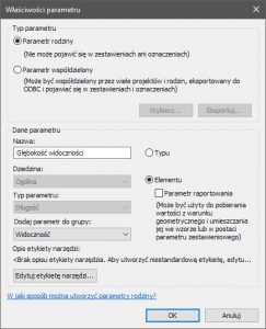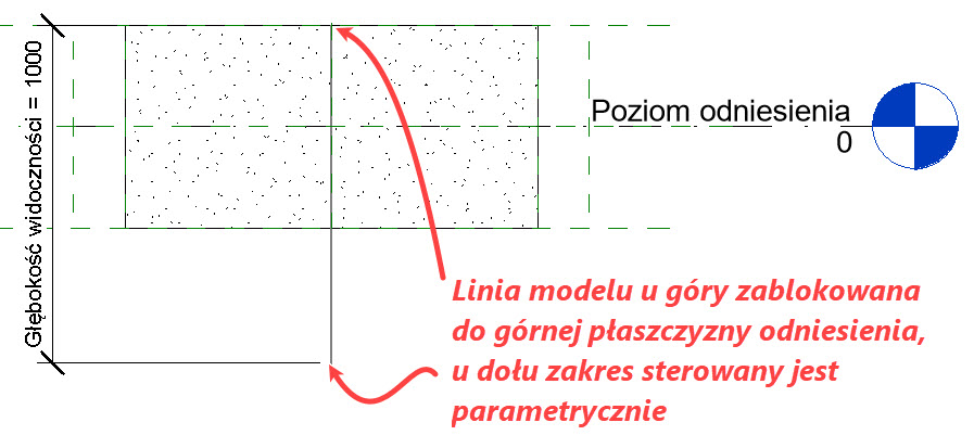 Górny punkt wyrównujemy i blokujemy do górnej linii odniesienia belki, dla dolnego zakresu tworzymy wymiar od dolnego jej końca do górnej płaszczyzny odniesienia i zamieniamy na nowy parametr elementu np. o nazwie Głębokość widoczności, w grupie Widoczność.