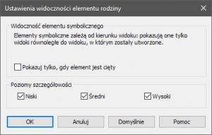 Dla konstrukcyjnej belki żelbetowej, której standardowa rodzina nie posiada swojej reprezentacji symbolicznej, w widoku z góry, narzędziem (Linia symboliczna) na podkategorii Ramy konstrukcyjne [widoczne], obrysowujemy krawędzie belki, z zablokowaniem wszystkich czterech krawędzi do płaszczyzn konstrukcyjnych belki. Przypisujemy czterem liniom w Ustawieniach widoczności widoczność dla wszystkich poziomów szczegółowości: Niski, Średni oraz Wysoki. Belki stalowe posiadają swoją reprezentację symboliczną dla poziomu szczegółowości Niski związaną z ich funkcją konstrukcyjną, więc dla nich wybralibyśmy tylko Średni oraz Wysoki.