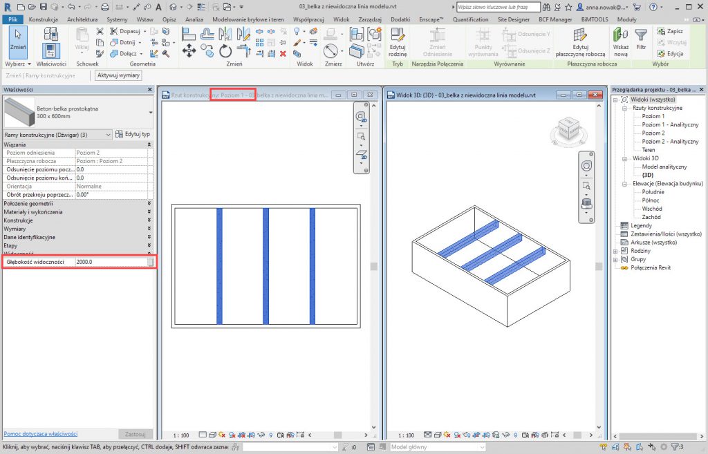 Dowolną metodą wybieramy wszystkie belki zmienionej rodziny i ustawiamy belkom odpowiednio parametr Głębokość widoczności na dostatecznie dużą wartość, aby niewidoczna linia modelu przecinała płaszczyznę cięcia rzutu. W przypadku projektu przykładowego ustawiam 2001mm.