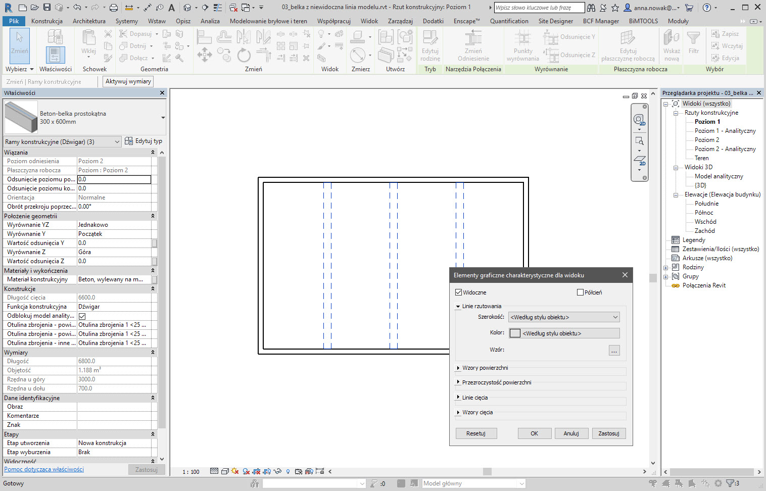 Można teraz nadpisać dla belek ich prezentację za pomocą polecenia Nadpisz elementy graficzne w widoku>Według elementu i sprawić, aby były przedstawione przerywaną linią bez szrafu materiału.