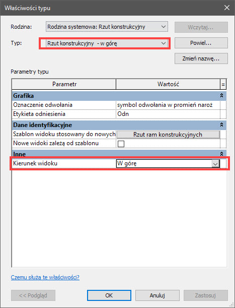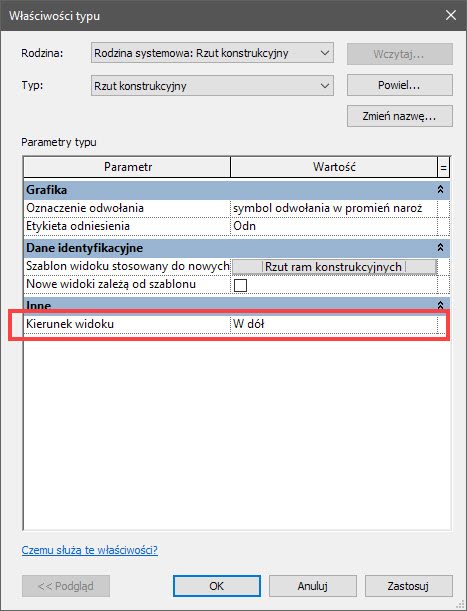 W sekcji Inne znajduje się opcja Kierunek widoku, ustawiona jako W dół. Powielamy rodzinę „Rzut konstrukcyjny”, nazywając duplikat „Rzut konstrukcyjny – w górę”. Widoki, utworzone na bazie tej rodziny będą zbierane w przeglądarce w osobnym węźle.