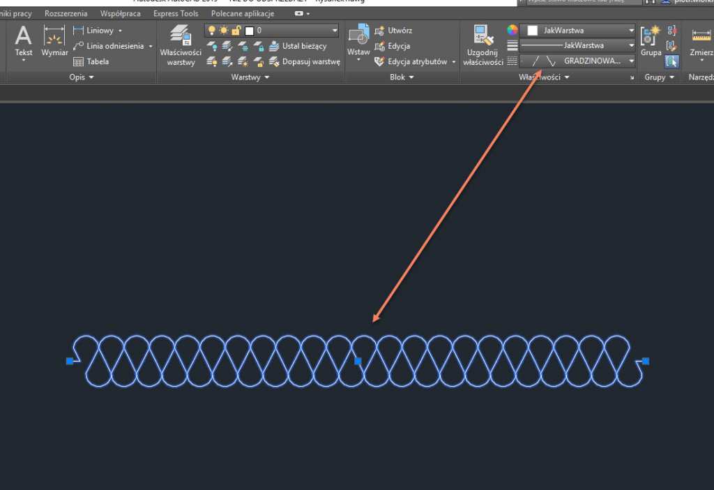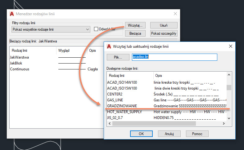 Dodajemy go z dostępnych stylów linii zapisanych w programie. Jeśli taki styl nigdy nie był używany, należy go wczytać do menadżera rodzajów linii.