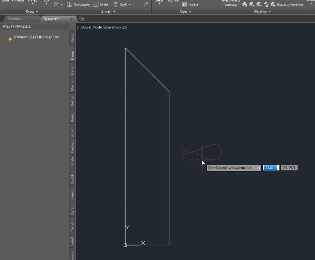 Wstawianie działa na takiej samej zasadzie jak rysowanie linii: podajemy dwa punkty (początkowy i końcowy), a wielkość izolacji można dostosować skalą linii we właściwościach.