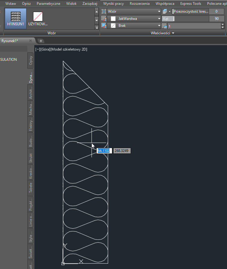 Dzięki temu można wypełniać pod odpowiednimi kątami praktycznie każdy zamknięty obszar. Jedynie wielkość izolacji ustawia się poprzez zmianę skali kreskowania. Aby skorzystać z tej opcji, należy pobrać z sieci i umieścić w odpowiedniej lokalizacji (C:\Users\<nazwa_użytkownika>\AppData\Roaming\Autodesk\AutoCAD Mechanical <wersja>\ R<wersja>\plk\Support) plik z rozszerzeniem .PAT, który odpowiada za wzór kreskowania. Można bezproblemowo znaleźć darmowe wzory kreskowania, wpisując w wyszukiwarce internetowej frazę np. autocad insulation hatch.