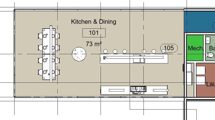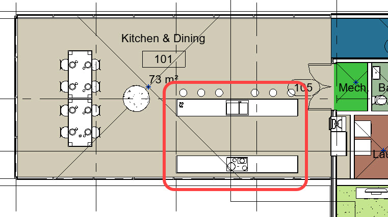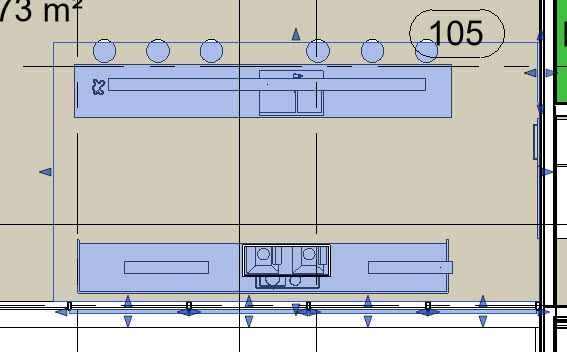 Posłużę się przykładem zagospodarowania przestrzeni kuchni w znanym projekcie przykładowym Revit. Dobór mebli, osprzętu, oświetlenia to bardzo często dość specyficzne zadanie, które wymaga skoncentrowania się tylko na przestrzeni pomieszczenia kuchennego. Załóżmy więc, że obecny w tym modelu układ, złożony z dwóch długich szafek (komponenty Zabudowa), chcemy zastąpić samodzielnie opracowanym zestawem mebli, oświetlenia i osprzętu.