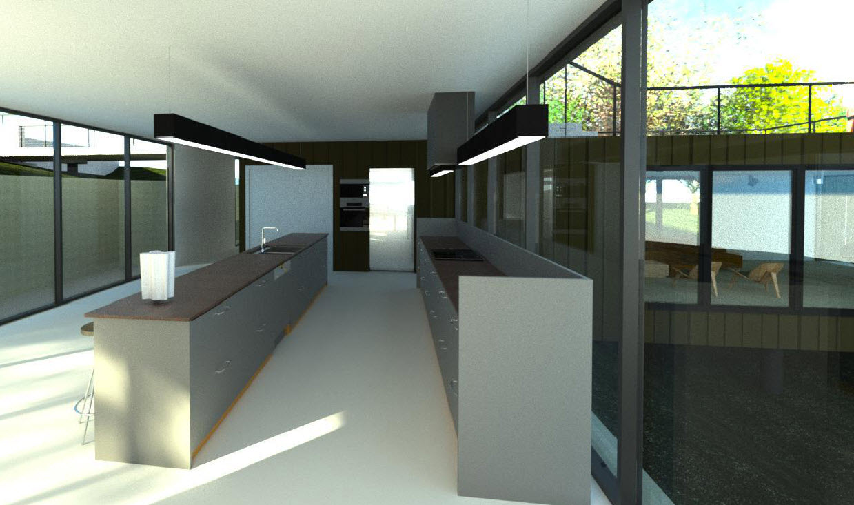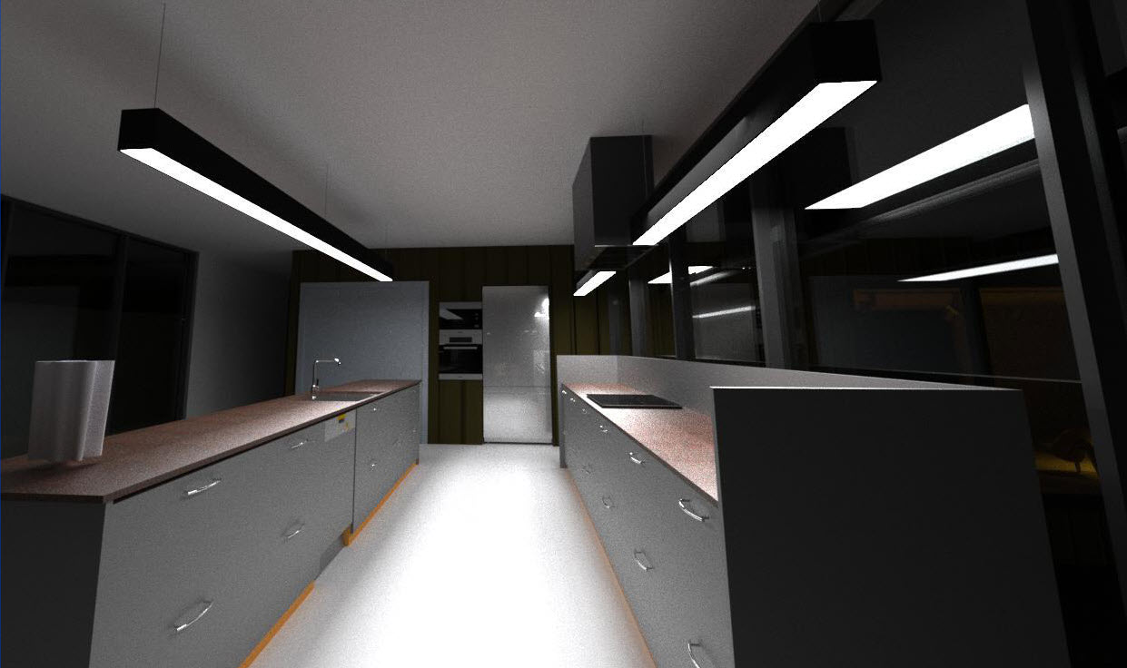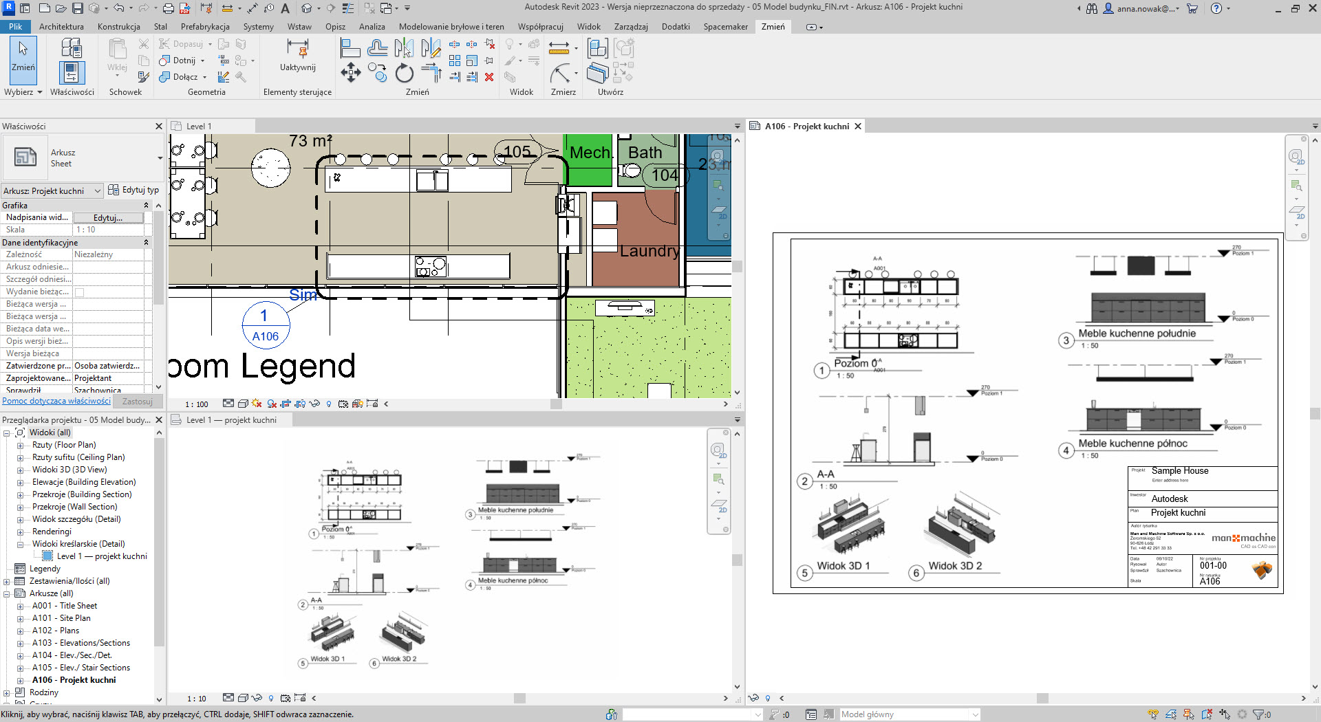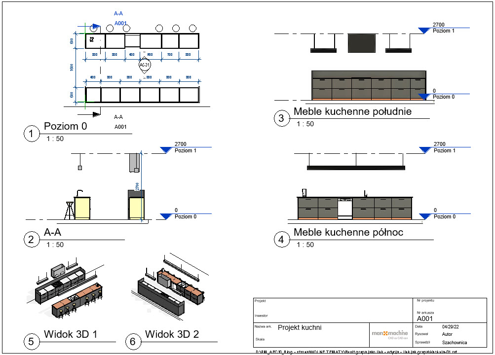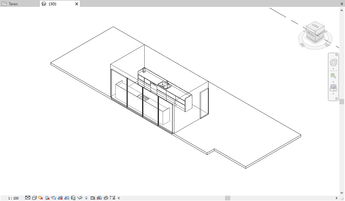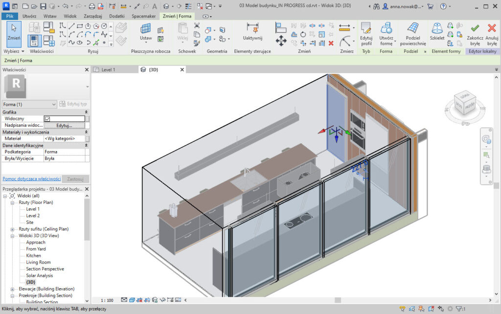 Poniżej widoki kuchni w modelu przykładowym Revit po przeprojektowaniu w tymczasowym pliku zewnętrznym opisaną powyżej metodą.